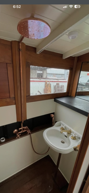 Asa installed the copper shower pan in the head. It came with the boat (but is likely not original). It has two drain holes that empty in to a grey water sump that will be shared with the sink. There is a pump in the sump with a float switch – discharge overboard. There is…