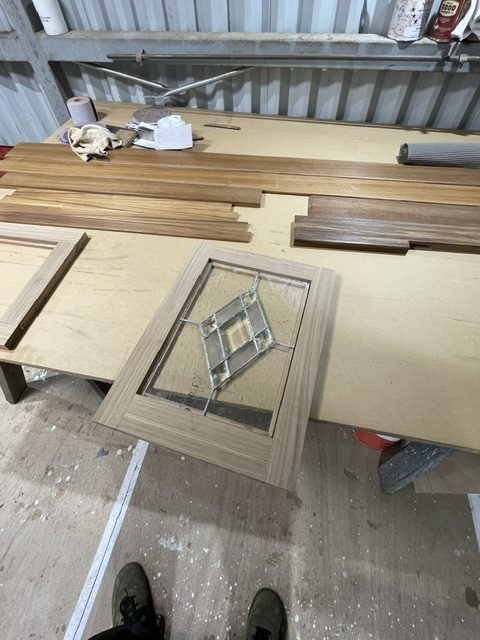 weekly update from Daryl… We worked on the pieces that were pulled off the boat initially that we know are being put back (ie what we scraped back in October), the beam caps, the doors and the door frames. Most of it was already scraped and somewhat sanded (minus one of the stair sets, so…