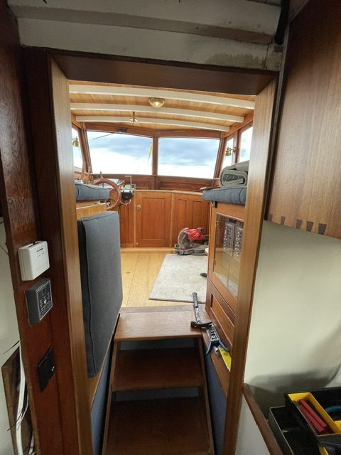 Nonchalant originally had a pocket door between the wheelhouse and the salon. We decided to abandon the pocket door separation for a number of reasons but that left an unsightly gap which Asa trimmed out in teak. There is still a panel to be installed above the door (over the water stained bulkhead) and more…